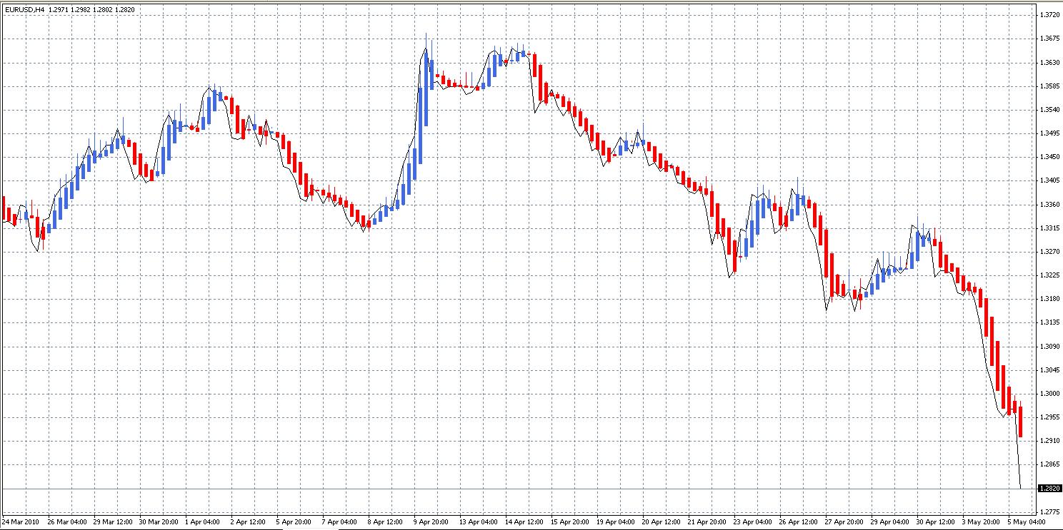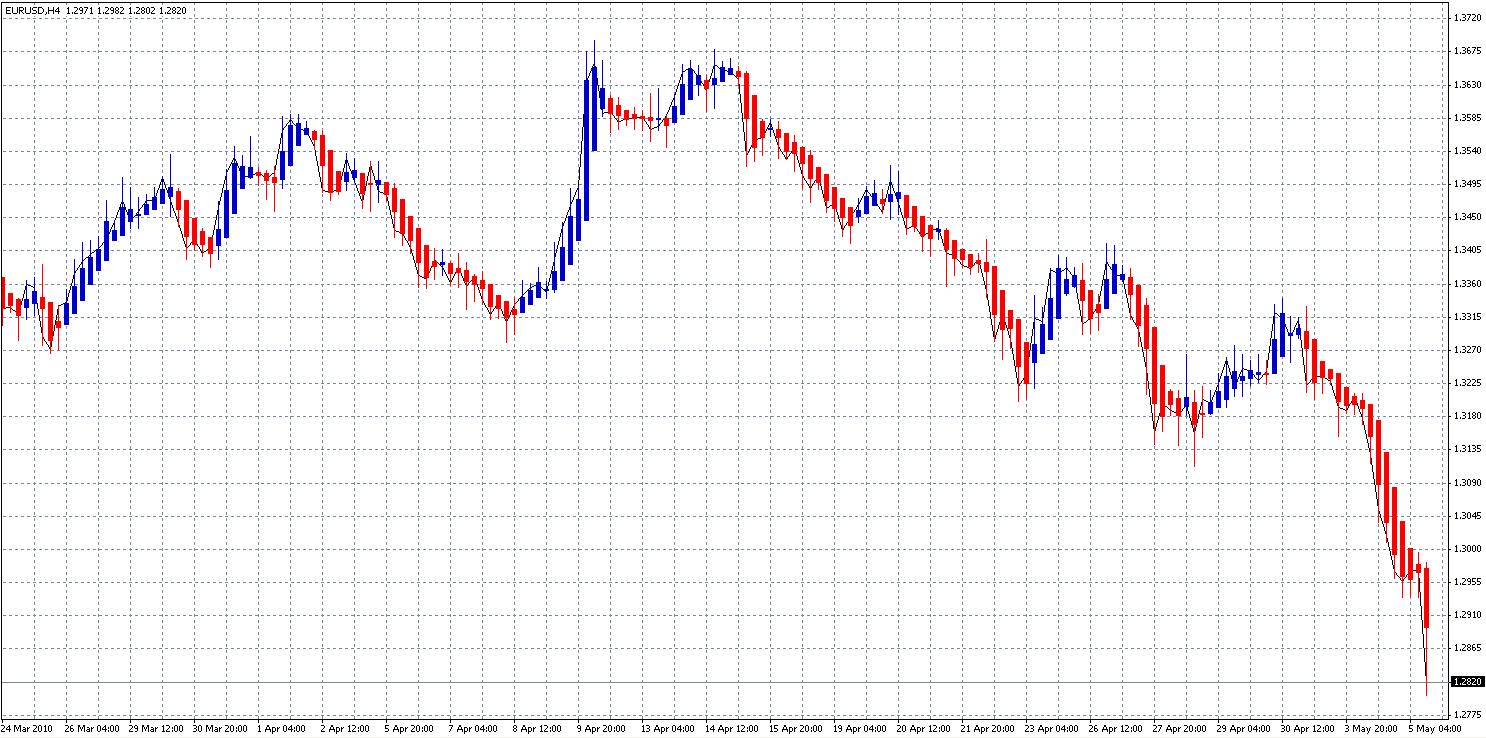 Con el fin de que puedan ver la apariencia final de las candelas Heikin Ashi suavizadas, a continuación se muestra la imágen de un gráfico de 4 horas para el par EUR/USD aplicando la plantilla para Metatrader 4 del Heikin Ashi suavizado (hacer click para agrandar imagen):